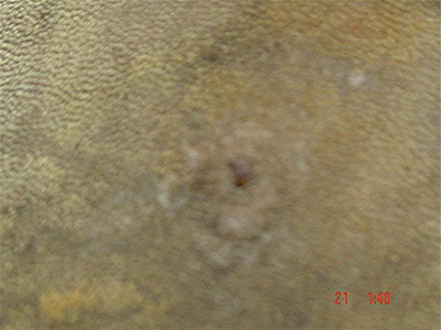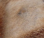 An infected Dermoid located mid back on a ridgeless mixed breed. He had a second Dermoid in the neck. His sister who is ridged, had a Dermoid in her neck.