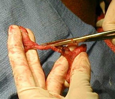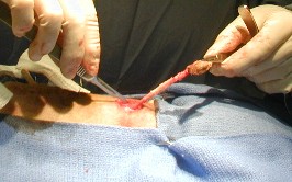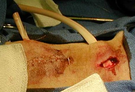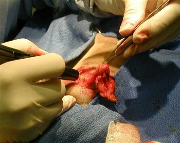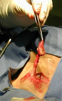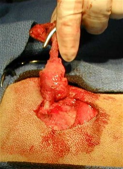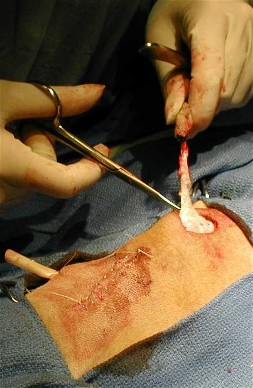 These last two photos show in exquisite detail the opening of the tube and the debris found inside that tube. This is a nine to 10 month old dog. One would not expect the build up to be so huge in such a young dog, but in fact it builds up quickly, and abscesses quite rapidly. The brown gunky tube filling is made up of dirt, debris, hair, sloughed off skin etc.