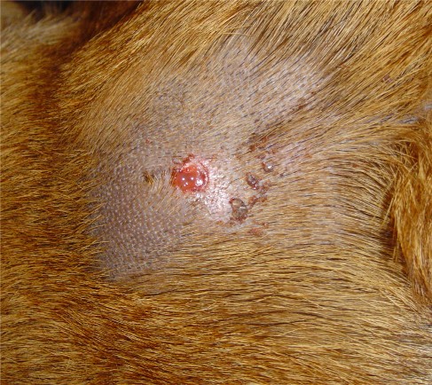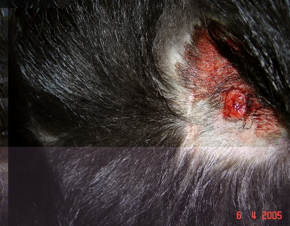 Tina is a mix of what looks like a Rhodesian Ridgeback and a Belguim Shepherd. She is nine years of age (in 2005) and has had three surgeries on this mess in her neck - her first surgery was at the age of about three years. This dog has been misdiagnosed for the past nine years. There seem to be a total of five “tubes” in her neck. The total internal scarring is severe.
